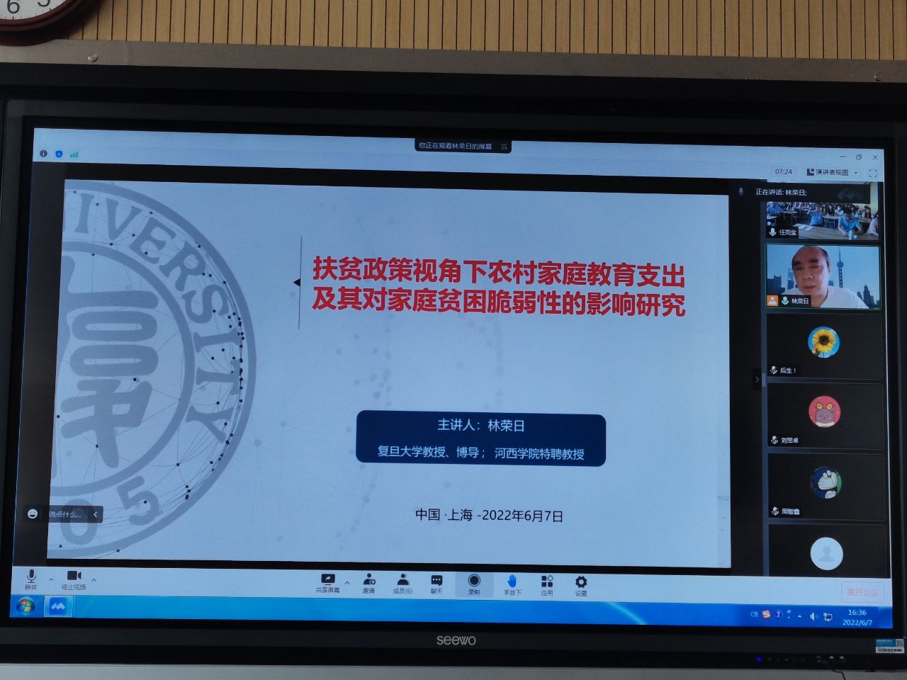 6月7日下午,tyc122cc太阳成集团举办了第二十二届祁连学术月校外专家学术报告会,邀请复旦大学博士生导师林荣日教授采用线上方式作了题为《扶贫政策视角下家庭教育支出及其对家庭贫困脆弱性的影响研究》的报告,公司师生100多人参加了报告会。