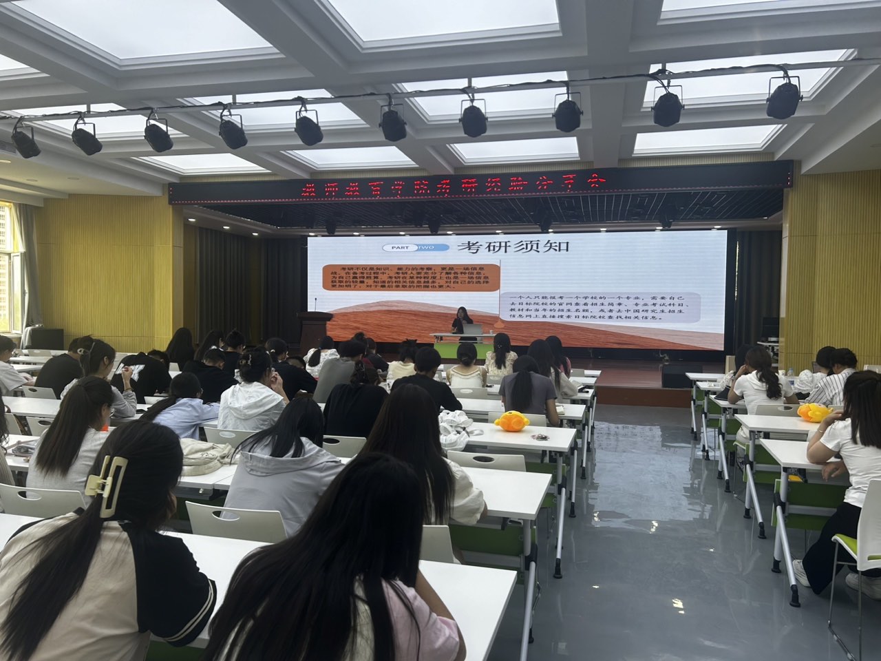 三位分享者根据自己复习的感悟,以不同的侧重点为大家分享了她们在考验信息收集、院校选择、考研疑虑、备考经验、复习计划以及考研心态等方面的经验和建议。分享会上不仅干货满满,而且“鸡汤”不断,不仅为大家带来了许多关于考研的有效复习方法和建议,还增强了同学们考研的信心和决心。整场分享会气氛活跃,掌声不断。